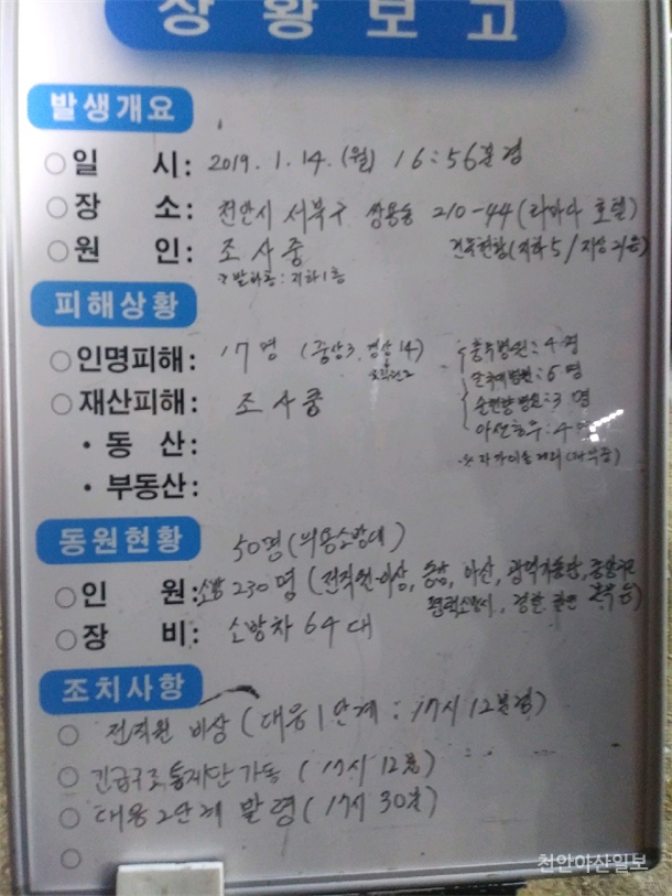 ÁøÈ¿¡ ¾î·Á¿òÀ» °ÞÀ¸¸ç ¼Ò¹æ´ë¿øµéÀÇ °í±ººÐÅõ¿¡µµ ºÒ±¸ °á±¹ »ç¸ÁÀÚ 1¸íÀÌ ¹ß»ýÇß´Ù. ºÎ»óÀÚµµ 1¸í Ãß°¡µÅ ¹ã11½Ã ÇöÀç »ç¸Á1¸í ºÎ»ó 19¸íÀ¸·Î ÀáÁ¤ Áý°èµÆ´Ù. »ç¸ÁÀڴ ȣÅÚÁ÷¿øÀ¸·Î ¾Ë·ÁÁ³À¸¸ç ÃÖÃÊ ½Å°íÀÚ·Î ÀÎ¸í±¸Á¶¸¦ À§ÇØ µ¿ºÐ¼ÁÖÇÏ´Ù ³¡³» ¼ûÁø°ÍÀ¸·Î ¾Ë·ÁÁ® ÁÖÀ§ÀÇ ¾ÈŸ±î¿òÀ» ´õÇß´Ù. ÈÀçÁø¾ÐÀº À¯µ¶°¡½º·Î °¡µæÂ÷ ¾Ö·Î¸¦ °Ý°í ÀÖ´Â ½ÇÁ¤À̸ç ÀܺÒÁ¤¸®±îÁö´Â ¹ã»ùÀÛ¾÷ÀÌ ºÒ°¡ÇÇÇÒ Àü¸ÁÀÌ´Ù.